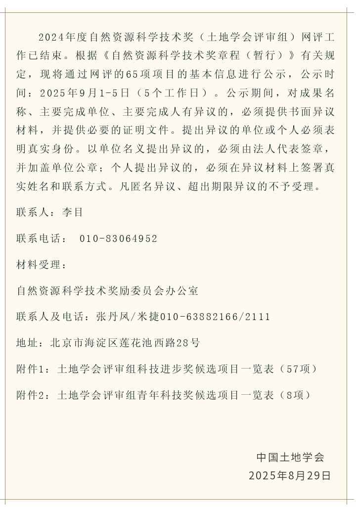 公示|2024年度自然资源科学技术奖 (土地学会评审组)网评结果公示
